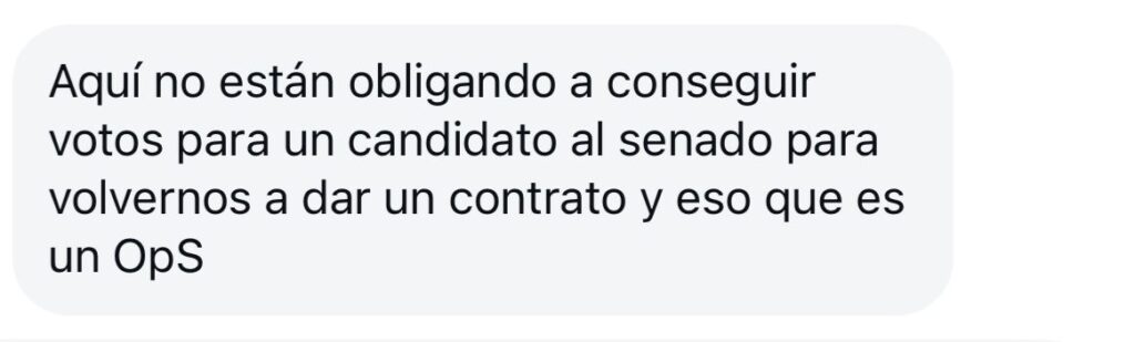 Otra de las denuncias afirma: “Aquí nos están obligando a conseguir votos para un candidato al Senado para volvernos a dar un contrato, y eso que somos OPS”.