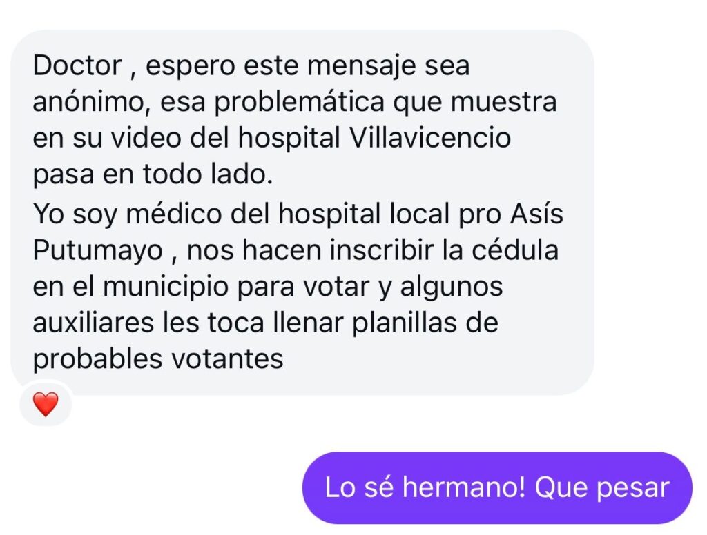 El candidato también dio a conocer denuncias concretas recibidas a través de sus redes sociales, cuyos autores solicitaron reserva total de identidad por temor a represalias laborales. Una de ellas señala: “Esa problemática del hospital de Villavicencio pasa en todo el país. Yo soy médico del Hospital local Puerto Asís de Putumayo; nos hacen inscribir la cédula en el municipio para votar y a algunos auxiliares les toca llenar planillas de probables votantes”.